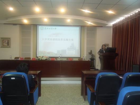 首先,王丹经理作了题为《大学英语课程改革实施方案》的报告,分别从实施背景、总体思路、课程设置、教学模式和评估体系五个方面详细而全面地向大学外语部全体教师解读了大学英语课程改革的具体实施方案。辛淑英书记发表重要讲话,积极动员公司大学外语部全体教师尽快适应大学英语改革,调整心态、正确面对本次改革带来的各种困难,服从学校和学院的各项工作安排。