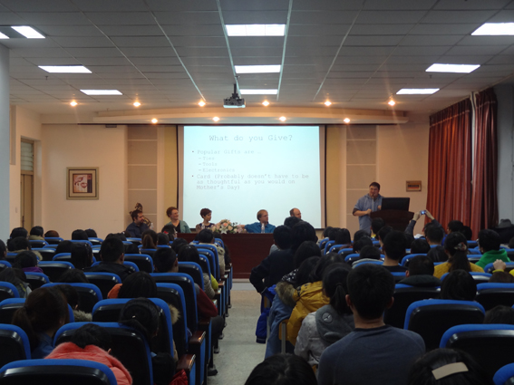 这次讲座是以西方节日为切入点,主讲教师通过介绍西方节日起源、发展及庆祝方式,展示了其深厚的文化背景。六位外籍教师轮番上阵,用风格迥异的演讲方式介绍了各种各样的西方节日,并精心准备了图文并茂的PPT为演讲添彩。Heather老师声情并茂地将万圣节的起源发展和经典的“Trick or Treat”的由来娓娓道来;Thomas老师以英国绅士特有的幽默方式讲述了Bonfire’s Night和关于Guy Fawkes的一段历史故事;女教师Lizzie带领同学们穿梭于美、法之间,领略Mardi Gras、Lent和Easter节日的异域风情;金发外教Micah向同学们介绍了在美国人们是如何度过Memorial Day和Labor Day假期的,还风趣地介绍了一个新奇的节日——π Day;Steven老师则用自己的实际经历介绍了外国人的Father&Mother’s Day;最后,由Ben老师介绍了美国人的国庆节——Independence Day。外教发言环节结束之后,Ben老师鼓励同学们大胆举手勇敢地向外教们提出问题,几位外教也对同学们的问题一一耐心地解答。整场讲座气氛活跃,同学们不时被外教们的幽默打动,报以热烈的掌声。在讲座结束后的自由交流环节,同学们围坐在一起,纷纷与外教沟通交流。