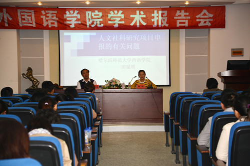 2014年10月8日下午1点40,哈尔滨师范大学西语学院田延明教授在文博楼1019室作了题为“人文社科研究项目申报的有关问题”的报告。报告会由孙爽副经理主持,云顶国际yd333全体老师和部分硕士研究生聆听了此次报告。