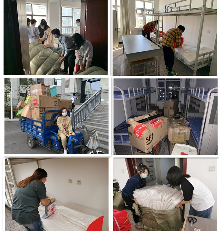 因疫情防控需要,今年新生入学的员工工作是一次严峻的大考。新生家长无法入校,面对此种情况,一支由高年级党员、低年级优秀团员组成的“小语小言迎新志愿服务队”的志愿者们,“一对一”提前帮助新生完成备品购买、床铺整理、行李搬运以及报到当天的接待等工作。9月10日中午,在新生辅导员高敏老师的带领下,志愿者同学们提前将新生的被品搬运到新生寝室楼内,并“爱心专送”至新生寝室,为新生铺好床铺。辅导员李欣书老师带领员工会的员工干部将本校升学的研究生行李逐件的送到寝室中,做到服务细致入微。