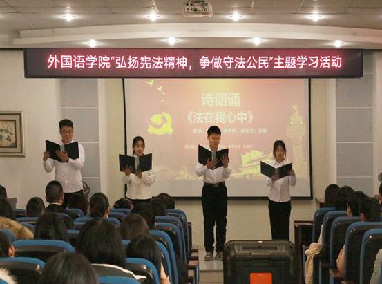 活动开始主持人首先详细介绍了宪法的起源与发展,强调了作为老员工要担负起学习宪法,遵守宪法的责任与义务。随着一首诗朗诵《法律援助》本次活动正式拉开帷幕,铿锵有力的朗读声,让在场的每一位同学都深刻了解到,宪法是维护我国广大人民根本利益最坚实的法制保障。随后宪法知识优秀征文和手抄报获奖同学们依次上台,与在场同学分享了作品的创作思路与所表达的法律知识,通过图文解说的形式加深同学们对宪法与法律的认识。最后是同学们最为期待的法律知识竞赛冠亚军的角逐环节,一道道题目就是一个个宪法小知识,现场气氛活跃,高潮不断,浓厚的学习氛围展现出了外语学子学习宪法的热情与将宪法知识内化于心的学习态度。活动最后,全体人员起立大合唱《宪法伴我们成长》并进行宣誓。