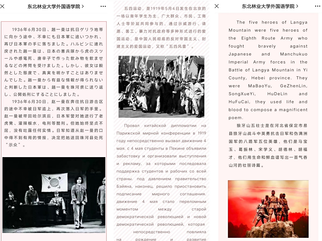 双语学“四史”活动将党史学习与专业兴趣有效结合,预备党员培训班的学员们用中英、中日、中俄双语,声情并茂地向全校师生讲述四史故事,展现了积极向上的精神风貌,切实做到在语言学习中认识历史、体悟历史,增强了同学们在实践中守初心、担使命的思想自觉和行动自觉。“学党史,悟思想,办实事,开新局”相信预备党员培训班的学员们在日后的学习和生活中定会做到不忘初心,牢记使命,树立理想信念,提高思想觉悟,凝聚起实现中华民族伟大复兴的磅礴力量,为建党百年献礼!