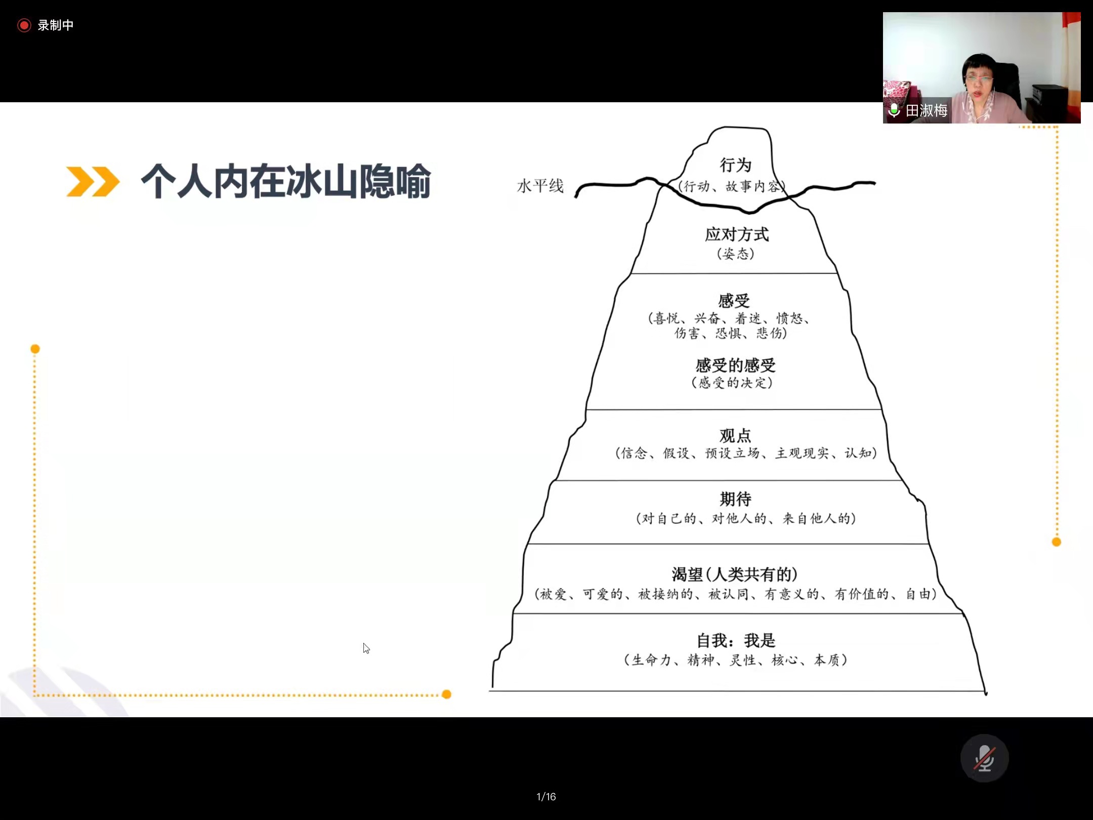 田淑梅教授在讲座的前半程向同学们介绍了情绪在人们生活里的作用和影响,她运用举例说明以及“情绪保险箱”等方法教给同学们如何能有效地管理自己的情绪。随后,田淑梅教授讲授了如何运用“冰山理论”进行有效情绪管理的方法,并带领同学们结合个人实际情况代入到冰山图中,形成对自己的总体认知,从而达到让员工更全面、深入地关注自身、了解自身的目的。
