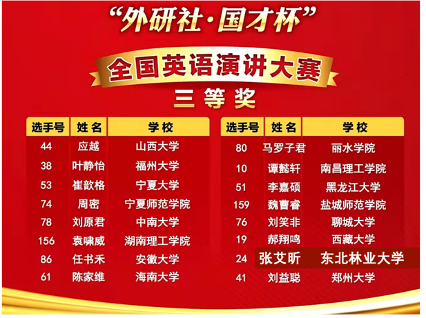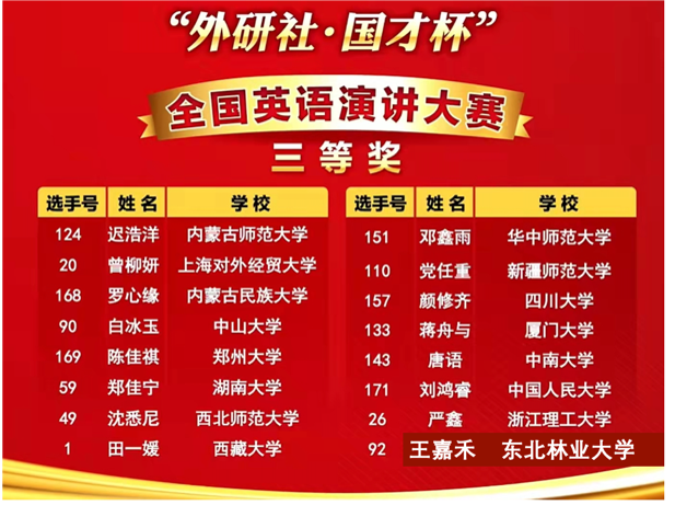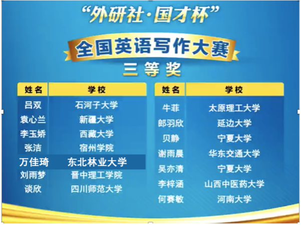 12月10日,2021“外研社·国才杯”全国老员工英语挑战赛圆满落幕。经过激烈的角逐,来自公司文法学院万佳琦同学获得“外研社·国才杯”写作大赛全国三等奖;经济管理学院王嘉禾,文法学院张艾昕获得“外研社·国才杯”演讲大赛全国三等奖。