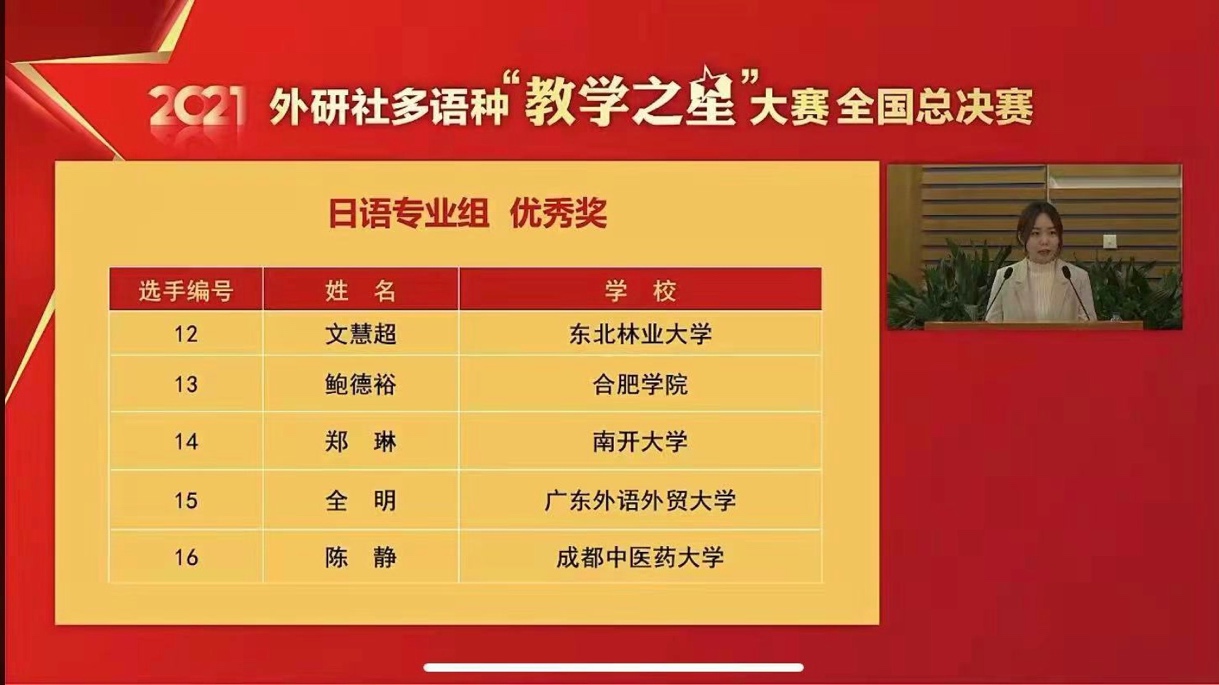 公司日语系教师文慧超在此次大赛中从全国几百位选手中脱颖而出,作为东北地区唯一入围的参赛教师,挺入全国十六强,最终取得优秀奖。