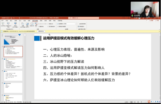 在本次讲座中,田老师通过生活中的具体案例,结合云顶国际yd333教学特色,阐释了心理压力的表现情况、特点、来源及影响,并分析了线上教学期间和日常生活中公司教师可能遇到的问题。基于对冰山隐喻理论的讲解,田老师为如何做自己的主人提出方法建议,例如有意识地觉察到压力,发现压力扳机点,改变关于自己与他人的看法等。整场讲座氛围轻松愉快,在田老师的细致讲解下,从心理学角度带领大家更加清晰认识和了解自己。