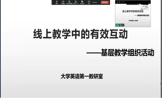 2022年5月11日13点30分,大学英语第一教研室全体教师通过钉钉会议举行了基层组织建设日活动,本次活动由教研室主任王晓妍主持,会议主题为线上教学中的有效互动。