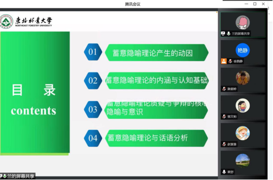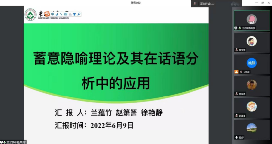 为促进优秀科研成果的交流,创造研究生学术交流的机会,云顶国际yd333于2022年6月9日通过“腾讯会议”举行了研究生(语言学方向)学术论坛活动。本次学术论坛主题为蓄意隐喻理论及其在话语分析中的应用,翟舒老师主持,朱秀芝老师和张鸣瑾老师为指导老师,由20级研究生兰蕴竹、赵箫箫和徐艳静同学主讲,云顶国际yd333语言学研究团队成员和语言学方向的研究生全体参会。