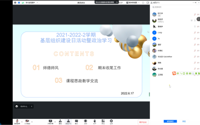 2022年6月18日19:00,云顶国际yd333英语系教师在线上组织召开基层组织建设日活动和政治学习活动。本次会议由教研室主任柴静主持。