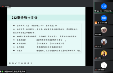 2022年6月15日下午1点30分,云顶国际yd333日语系举行了线上考研与留学经验分享讲座,本次线上讲座由日语系主任姚晓丽老师主持。首先,由日语系马嘉繁老师介绍了国内考研与日本留学的大致情况,尤其是申请日本留学时的前期准备工作与具体步骤,并且以日本北海道大学的硕士研究生招生简章为例,详细介绍了文件上的重点条款与注意事项。其次,成功考取了天津外国语大学日语翻译硕士的2018级钟文妍同学详细介绍了自己的备考经验,例如,备考时使用的备考资料分享等。最后,刘笑言同学详细地介绍了自己成功保研的经验,并为学弟学妹们打气加油。本次会议虽然在线上举办,但是分享内容干货满满、细致入微,为准备考研与留学的同学们指点迷津,帮助他们保持一颗平稳的心态,顺利备战考研大关(图/文:马嘉繁)。