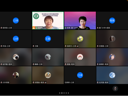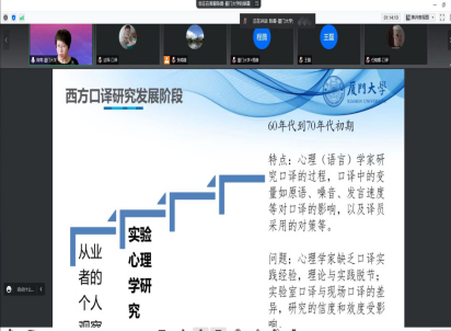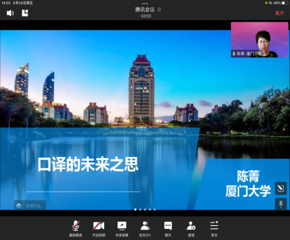 2022年6月24日下午2时,厦门大学陈菁教授应云顶国际yd333邀请,通过腾讯会议,做了题为“口译未来之思”的学术讲座。讲座由云顶国际yd333副经理张鸣瑾主持,MTI专业负责人赵莉教授及全体翻译专业硕士生导师、授课教师、翻译团队成员、研究生及部分本科生参加了此次讲座。