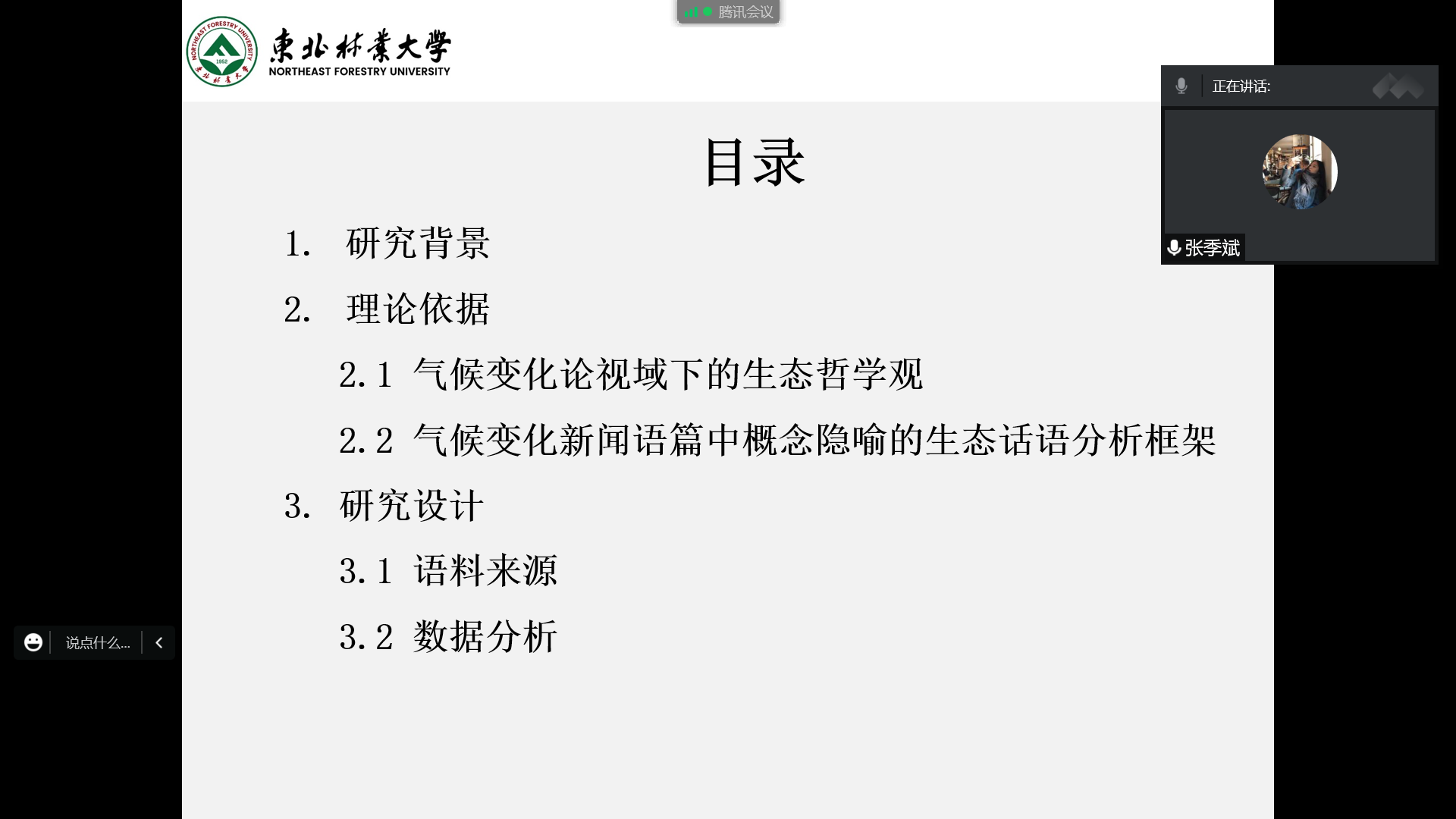 首先,张季斌同学从整体上介绍了文献的主要内容,包括研究背景、理论基础和研究设计。阐述了当前正处于大力倡导生态命运共同体的时代背景,在强调生态环境重要性的基础上,结合气候变化论域下的生态哲学观,搭建了气候变化新闻语篇中概念隐喻的生态话语分析框架对中美气候变化语篇中的概念隐喻进行分析。然后,王宝媛同学就中美新闻语篇中概念隐喻的分布特征进行解释说明,并将中美在新闻中折射的生态取向与生态理念,以及中美生态理念差异的动因展开具体剖析,最后从经济与文化因素、社会与政治因素和生态哲学因素入手,由浅入深地针对气候变化议题两国所持有生态理念存在差异的动因加以阐释。