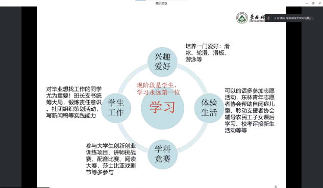 以专业排名第一毕业的杜铭学姐从独特的角度出发,不仅全面细致地分享了自己宝贵的学习经验,还提到了其被推免到中国人民大学的保研历程,同时也特别为大家带来了更多优秀学长学姐的温暖寄语。学姐甚至在回忆老员工涯时,语至动情处潸然泪下,足以见她对东林的深沉情感。学姐的真挚寄语如一盏盏明灯,点亮了同学们前行的道路。她用真诚动人的话语劝诫大一新生:“莫惜金缕衣,不负少年时。”她也激励着大一新生用全新的面貌和姿态去迎接挑战!