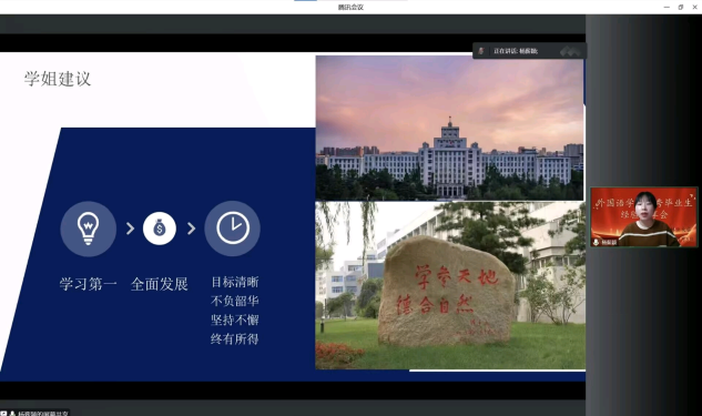 人间十月有幸事,落叶与风再相逢。金秋时节,在东林度过美好的大学时光后,学长学姐们怀揣着硕果重新回到母校,以自身经历向迷茫的大一新生给予建议。云顶国际yd333优秀毕业生经验分享会于2022年11月5日18:00-20:45在腾讯会议顺利召开。分享会由英语系主任柴静老师主持,云顶国际yd333第二课堂活动负责人赵莉老师应邀出席分享会。云顶国际yd333英语专业大一新生全体、来自兄弟院校河南城建学院、哈尔滨剑桥学院、黑龙江工商学院的部分同学共300人参加了分享会。宋佳佳、杜铭、杨薪颖、刘璐、常相荣、张川东六位优秀的学长学姐们以“如何度过老员工活”为主题,为大一新生带来了经验分享,以此来帮助大一新生更好地度过老员工活。