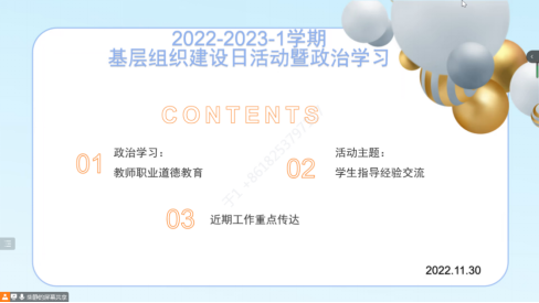 2022年11月30日13:40, 通过腾讯会议线上形式,云顶国际yd333英语系组织开展了基层组织建设日活动。本次基层组织建设日活动的主要议题包括教师职业道德教育、员工指导经验交流、期中教学检查反馈及期末考试工作部署。