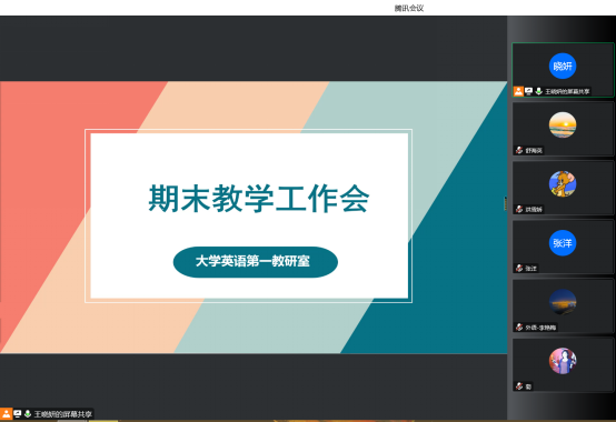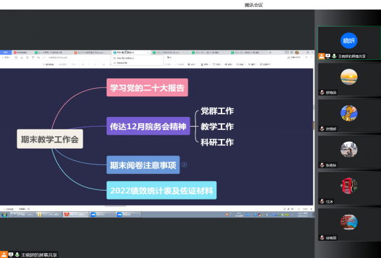 2022年12月1日13点30分,大学英语第一教研室通过线上会议形式,召开了2022-2023-1学期期末教学工作会,会议内容包括深入贯彻落实党的二十大会议精神之推动绿色发展、加强新时代生态文明教育、传达12月份信息会精神、期末教学工作安排。大学英语第一教研室全体教师参加了本次活动,活动由教研室主任王晓妍主持。