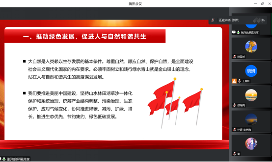 张洋老师带领全体同事认真学习了党的二十大报告中推动绿色发展,促进人与自然和谐共生和全面加强新时代生态文明教育的部分,引用习近平总书记的话语凸显了生态文明教育的重要性和迫切性。“生态文明建设已经纳入中国国家发展总体布局,建设美丽中国已经成为中国人民心向往之的奋斗目标。中国生态文明建设进入了快车道,天更蓝、山更绿、水更清将不断展现在世人面前。”生态文明建设是关系中华民族永续发展的根本大计,而教育是国之大计、党之大计。推进生态文明建设,长远之计是化育人心、润物无声,教育一代代青年牢固树立社会主义生态文明观,推动形成人与自然和谐发展现代化建设新格局。因此,开展新时代生态文明教育,必须以习近平生态文明思想为指导,把生态文明教育融入育人全过程,为生态文明建设提供全方位的人才、智力和精神文化支撑,为全球生态治理和生态文明教育发展提供中国智慧和中国方案。生态文明教育担负着培养具备生态文明理念和素养的中国特色社会主义事业接班人的历史重任,必须充分发挥教育的基础性、先导性、全局性作用。