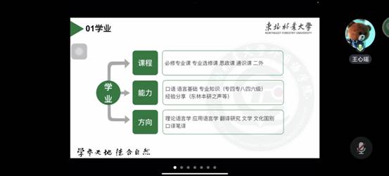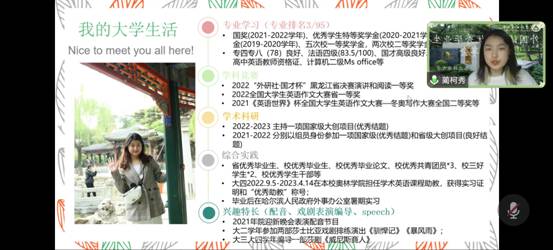 云顶国际yd333优秀毕业生经验分享会于2022年11月4日18:00-20:00在腾讯会议顺利召开。分享会由英语系主任柴静老师主持,云顶国际yd333赵莉教授应邀出席分享会。云顶国际yd333英语专业全体大一新生参加了会议。杜铭、刘璐、蔺柯秀、王心瑶四位优秀的学姐们以“如何度过老员工活”为主题,为大一新生带来了经验分享,以此来帮助大一新生更加充实地度过老员工活。
