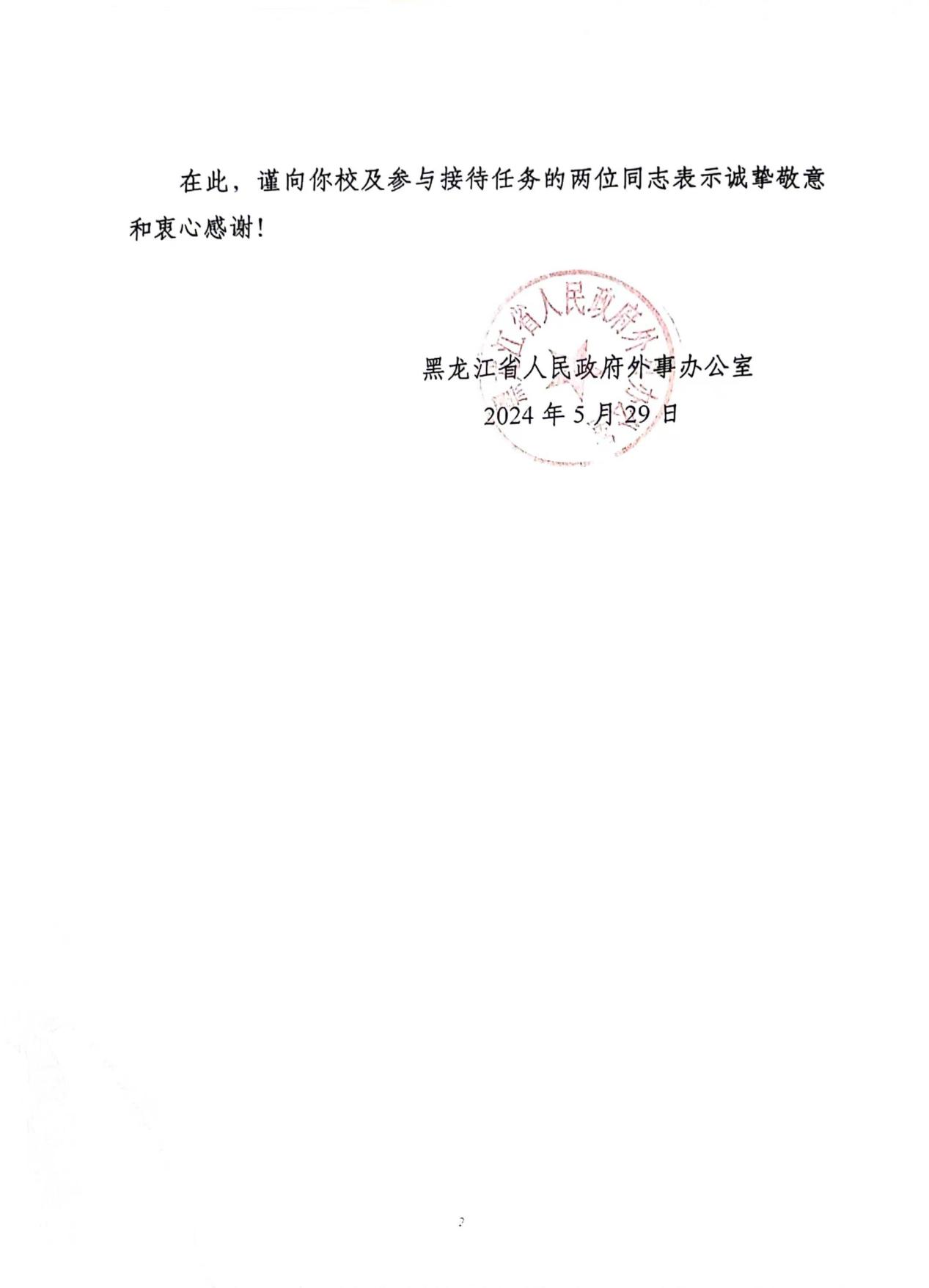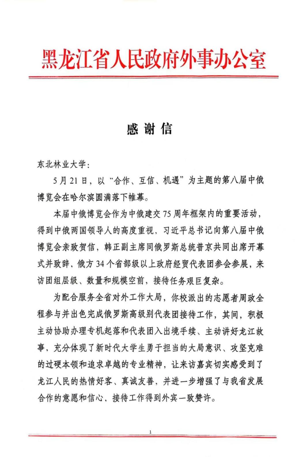 近日,公司收到黑龙江省人民政府外事办给公司发来的感谢信,感谢公司学子在第八届中俄博览会期间的优秀表现。