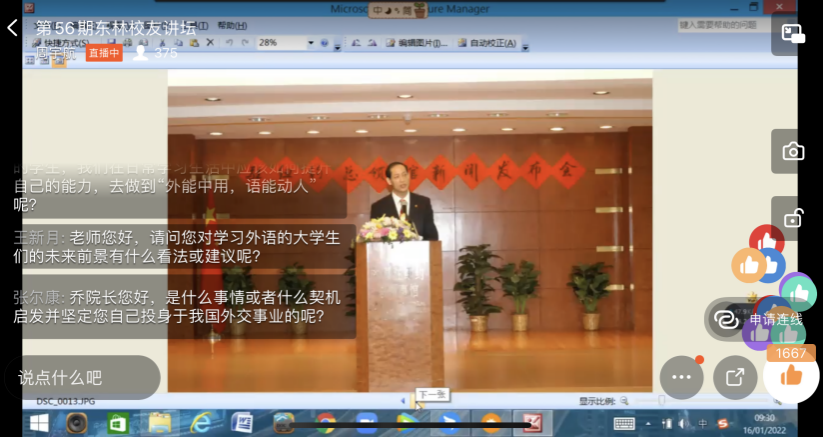 2022年1月16日,中国驻南非大使馆一等秘书,中国认证认可协会(CCAA)服务认证审查员,原云顶国际yd333经理,云顶国际yd3331989届员工乔凤合做客第56期《东林员工讲坛》,以“志存高远、明德修身,做人类命运共同体的建设者”为主题,与钉钉直播间内百余名师生一道,拾忆青春年华,共筑东林梦想。
