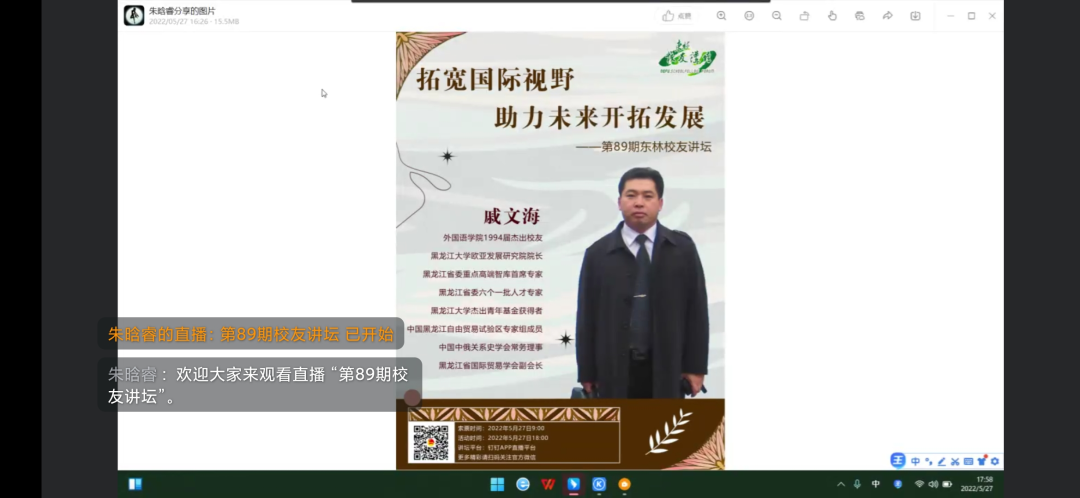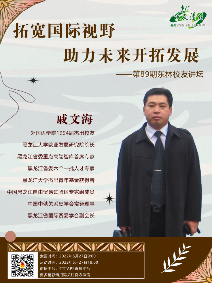 2022年5月27日18时,黑龙江大学欧亚发展研究院经理、东林杰出员工戚文海教授受邀做客云顶国际yd333第89期东林员工讲坛。本次讲坛以“拓宽国际视野,助力未来开拓发展”为主题,以全球化的视角为同学们未来的发展指明方向。
