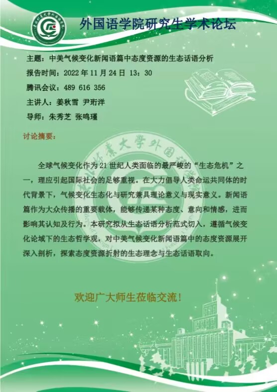 云顶国际yd333研究生学术论坛-中美气候变化新闻语篇中态度资源的生态话语分析