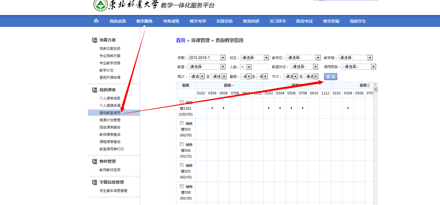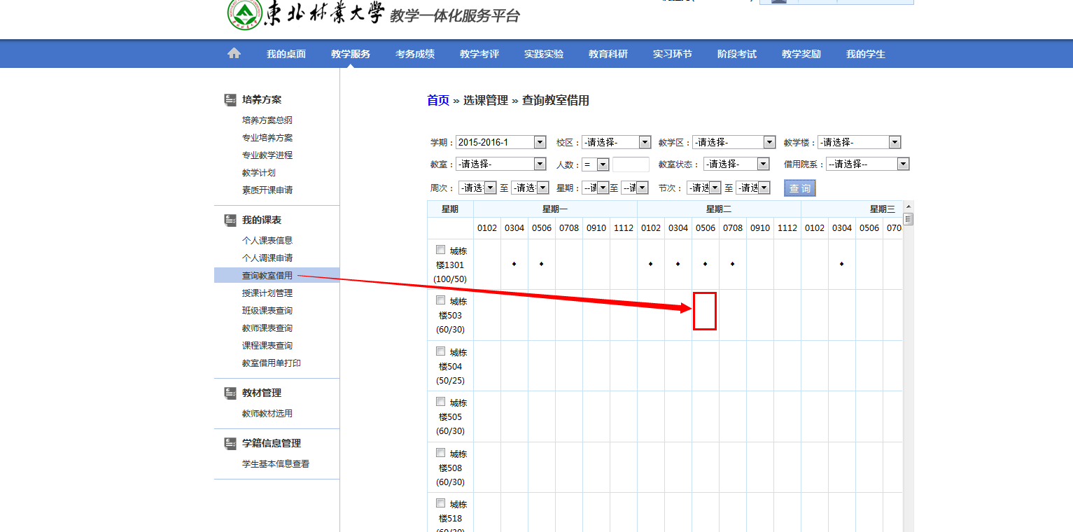 当看到自己想要的教室信息后,如下图所示鼠标左键点击空色框体(此处为要借用的教室)