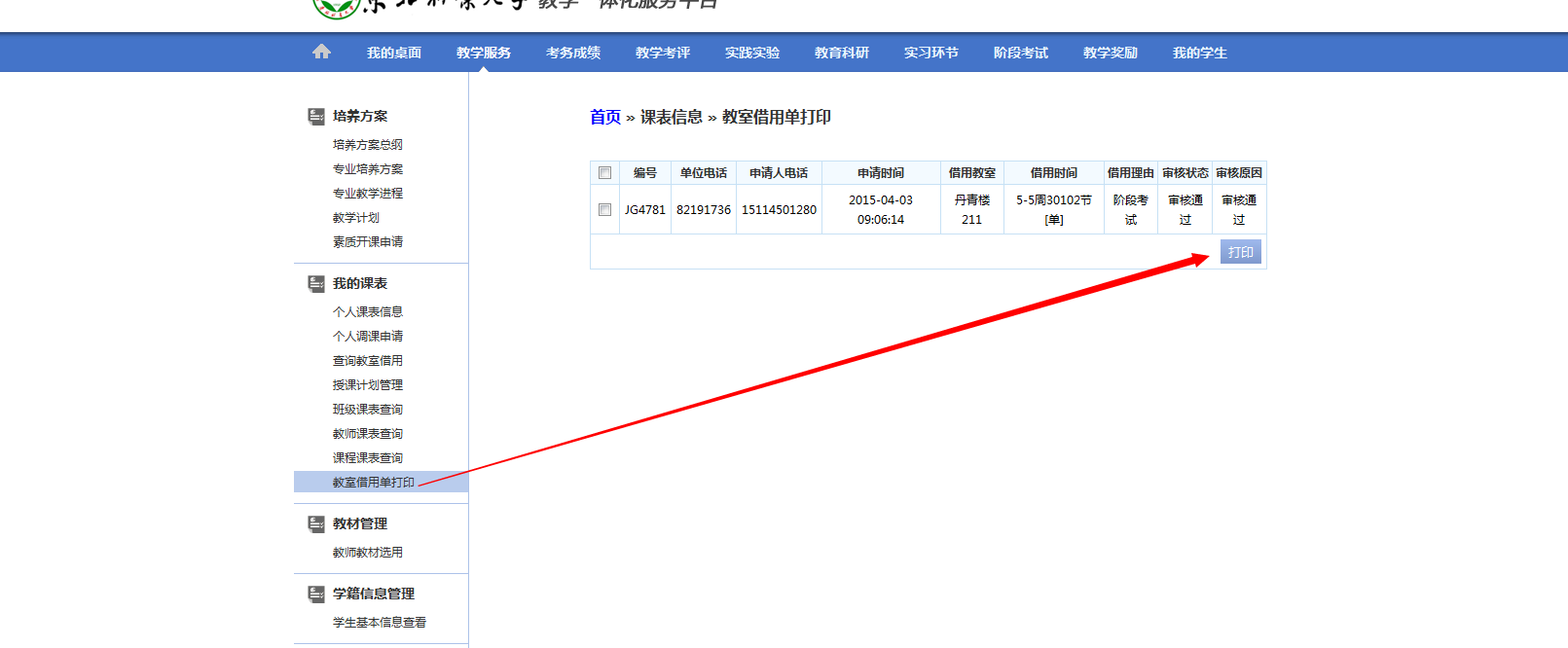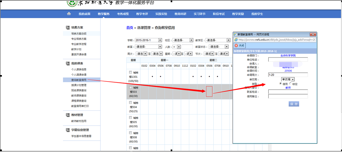 最后使用鼠标左键双击上图中的红色框题(此处为要借用的教室),会弹出填写对话框,按照实际情况填写保存既申请借教室成功