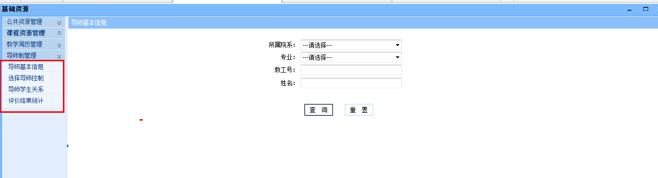 如下图所示菜单,第一个为可作为导师的老师名单,里面可设置所带员工的上限和对应专业(此处在教师基本信息维护页面有是否可为导师标识,选择是即可)